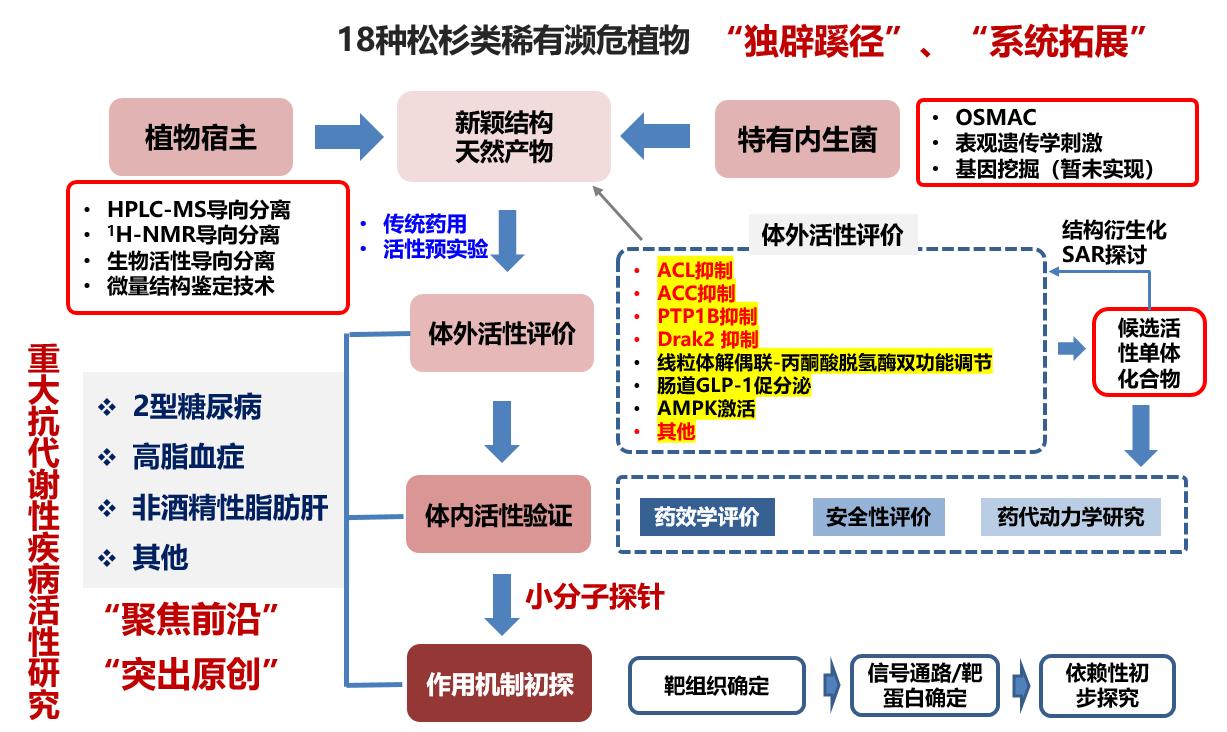 Based on the above research background, this project “focused on preclinical research” and “highlighted originality,” selecting 18 endemic rare and endangered conifer species in China to conduct systematic and in-depth chemical composition research on the secondary metabolites of these plants and related endophytes. It also evaluated the activity and related mechanism of action around high-druggable new targets/multi-targets (such as ACL, ACC, DRAK2, and PTP1B) that can regulate glucose and lipid metabolism disorders to discover lead compounds for new drugs that can treat major metabolic diseases (Figure 7).