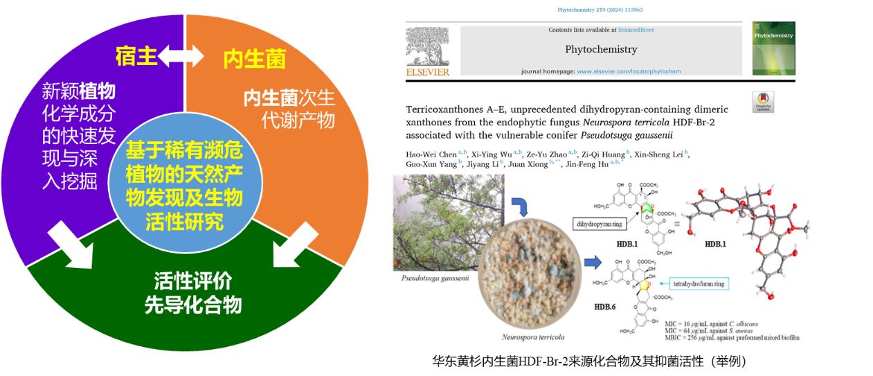 2. A total of 389 endophytic strains were isolated from fresh branches, leaves, or stem barks of various wild or cultivated rare and endangered pine and fir species, successfully establishing a unique endophytic bacteria library for Chinese endemic pine and fir REPs. Based on morphological and taxonomic identification, combined with screening results for chemical diversity and biological activity, 22 strains were selected for secondary metabolite research, leading to the isolation and identification of 214 compounds (including 57 new compounds and 9 new skeletal compounds belonging to 3 classes) (Figure 9). Notably, Neurospora terricola HDF-Br-2, an endophyte from Pseudotsuga gaussenii, produced a novel xanthone dimer with a dihydropyran ring, which was included in the ESI Highly Cited Papers in 2024 (Figure 9). Particularly, a polyene macrolide antibiotic FC was isolated from the secondary metabolites of an endophyte WP-1 from Pinus dabeshanensis (Appl Microbiol Biotechnol 2020, 104, 10437; patent application number 202010772722.4). This compound exhibited significant antifungal activity against agricultural fungi. Currently, joint development work on novel antifungal pesticides is underway, and the research team is also preparing to apply for related work on new pesticide registration (Principal Investigator: Li Jiyang, one of the key researchers in this major project).