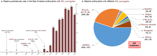 To address this, chemists have developed a series of SO₂ surrogates. Common SO₂ surrogates include the organic surrogate DABSO, developed by the Willis group in 2010 (J. Am. Chem. Soc., 2010, 132, 16372), and the inorganic surrogate metabisulfite, developed by Professor Wu Jie’s group in 2012 (Chem. Commun., 2012, 48, 10037). Due to the electrophilic nature of SO₂, early SO₂ reactions primarily involved organometallic reagents for the synthesis of sulfones. Subsequently, transition-metal-catalyzed coupling reactions were gradually developed. In 2014, Professor Wu Jie’s group pioneered an SO₂ insertion strategy based on radical reactions (Angew. Chem., Int. Ed., 2014, 53, 2451). Since then, radical reactions involving SO₂ have gradually emerged, related research has flourished, and it has become a hot topic.