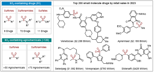 From the perspectives of sustainable development and green chemistry, developing simple and efficient methods for SO₂ capture is of great importance. SO₂ is an important sulfur source widely used in the synthesis of sulfonyl-containing compounds. Currently, 91 marketed drug molecules contain the -SO₂- (sulfonyl) structure, and over 120 pesticides contain the -SO₂- structure. Therefore, utilizing SO₂ in organic synthesis and drug synthesis holds significant academic and market value. However, the application of gaseous SO₂ has many drawbacks, greatly limiting its use in synthesis.