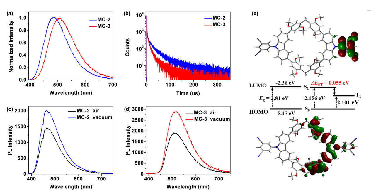 Figure 2 (a) Normalized photoluminescence (PL) spectra of MC-2 and MC-3; (b) Transient PL decay curves of MC-2 and MC-3; (c) PL spectra of MC-2 and (d) MC-3 under air and vacuum conditions; (e) Optimized ground-state geometry, orbital distribution, and energy levels of the dimeric macrocycle MC-2