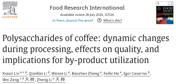 As one of the world’s most popular beverages, the determinants of coffee quality have long been a focus of scientific research. A research team led by Li Zheng from the School of Agriculture at Yunnan University, in collaboration with a team led by Zeng Wei from the School of Life Sciences at Taizhou University and other research institutions, published recently a research paper titled “Polysaccharides of Coffee: dynamic changes during processing, effects on quality, and implications for by-product utilization” in Food Research International, a CAS Q1 Top journal. This study is the first to extensively investigate the diversity patterns of coffee polysaccharide composition and the correlation mechanisms between polysaccharide composition and coffee sensory quality.