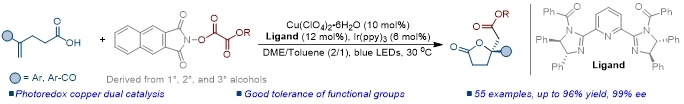Building on this prior research foundation, Professor Wu Jie’s team employed a synergistic photoredox/copper catalysis system to achieve the enantioselective alkoxycarbonyl-lactonization of alkenes, synthesizing ester-substituted γ-lactone compounds (Adv. Sci. 2025, e10918).