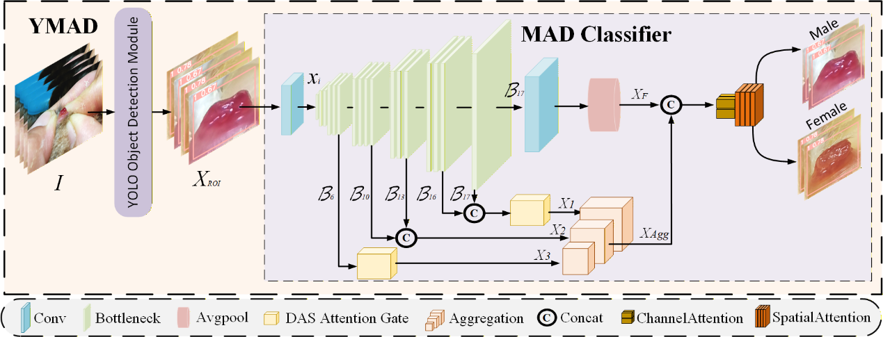 In poultry production, accurate sex identification of chicks is essential for optimizing feeding and management. Traditional techniques, such as laparoscopy and genetic testing, can determine chick sex, but they are complex, time-consuming, and require trained specialists, which limits their suitability for routine on-farm use. To address these challenges, the team established a dataset of chick gonad images and proposed a deep-learning method called YMAD (Figure 1) for chick sex classification, aiming to provide a more practical alternative to conventional approaches.
