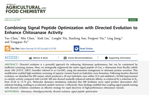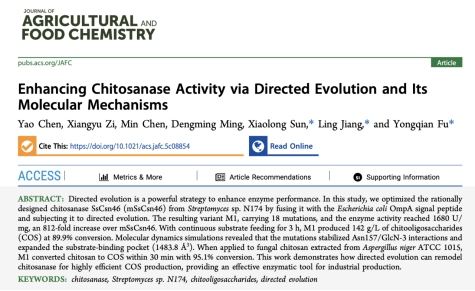The team led by Professor Fu Yongqian from the School of Life Sciences, in collaboration with Professor Jiang Ling from Nanjing Tech University, has successively published two experimental research papers on chitosanase in Journal of Agricultural and Food Chemistry (IF: 6.2, CAS Zone 1 TOP).