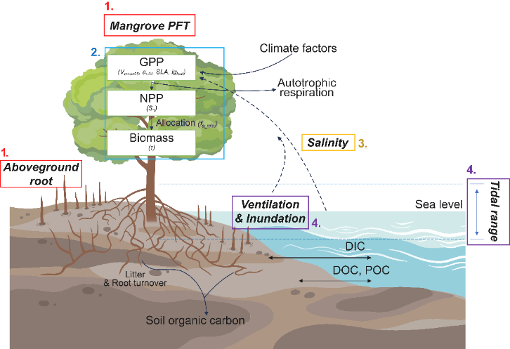 Mangroves have exceptionally high carbon-sequestration capacity and play an important role in lateral carbon exchange between land and sea. Accurately quantifying mangrove carbon dynamics under climate change and human disturbance is therefore essential for evaluating their potential to mitigate climate change and for informing conservation and management policies. However, most dynamic vegetation models do not explicitly represent mangrove-specific ecological processes, which can introduce biases in simulations of atmospheric carbon uptake by terrestrial ecosystems and in the carbon budgets of tropical countries.