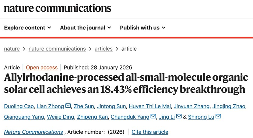 The research team led by Professor Lu Shirong from the School of Materials Science and Engineering published a research paper titled “Allylrhodanine-processed all-small-molecule organic solar cell achieves an 18.43% efficiency breakthrough” in the authoritative journal Nature Communications. Professor Lu Shirong and specially appointed researcher Zhong Lian are the corresponding authors, jointly supervised doctoral student Cao Duoling is the first author, and Taizhou University is the first affiliation.