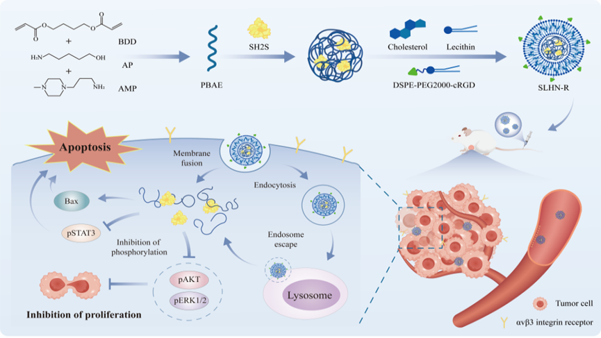 To address the aforementioned technical challenges, this research utilized the cationic polymer poly(β-amino ester), lipids, and cholesterol to construct SH2S-loaded lipid hybrid nanoparticles (SLHN) via an improved microfluidic technique. SLHN efficiently delivers SH2S into tumor cells through membrane fusion and clathrin-mediated endocytosis. Upon cellular entry, SLHN competitively displaces endogenous SH2 domain-containing proteins, inducing tumor cell apoptosis and inhibiting proliferation by blocking the phosphorylation of AKT, ERK, and STAT3. Furthermore, the cRGD peptide-modified SLHN demonstrates enhanced tumor-targeting capability, enabling efficient treatment of breast cancer at lower dosage levels with milder adverse reactions. The results indicate that SLHN exhibits excellent anti-breast cancer efficacy both in vitro and in vivo. After active targeting modification with cRGD, its therapeutic effect is further enhanced. This modification strategy enriches the application of lipid delivery systems in anticancer protein delivery and enhances the clinical application value of SH2 super-affinity proteins.
