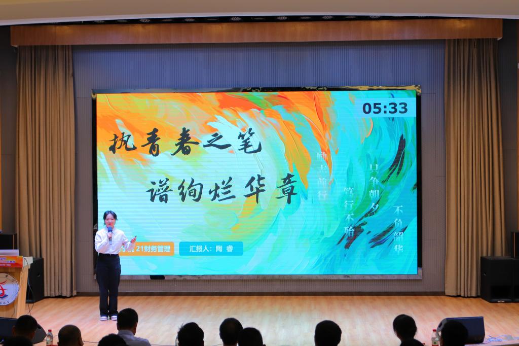 At the selection competition, candidates showcased their wonderful university life with exquisite PPTs, from such perspectives as professional course learning, discipline competitions, scientific research achievements, class organization, and volunteer service. Chen Hongrui from the School of Humanities told his story of striving for excellence by learning, cultivating, and practicing; Peng Kerui from the School of Materials Science and Engineering shared his learning journey with the theme of “No Inferior to Anyone”; Huang Shiyi from the School of Art and Design showed her willingness to spread Taizhou’s intangible cultural heritage through her solid design skills; Cai Jiayi from the School of Electronics and Information Engineering expressed her aspiration to be a “polyhedral youth” in the new era who is diligent in learning, innovative, practical, and responsible; Li Xin from the School of Civil Engineering and Architecture declared his desire to forge ahead on the path of rural construction with the reclamation spirit; Cao Shuhui from the School of Teacher Education (Physical Education) stated her intention to strive on the path of normal students with diligence, innovation and dedication. All the students have well demonstrated the spirit of young people in the new era, with their self-reliance, self-improvement, and hard work. Their rich learning and work experience as well as excellent performance have won rounds of applause from all teachers and students.