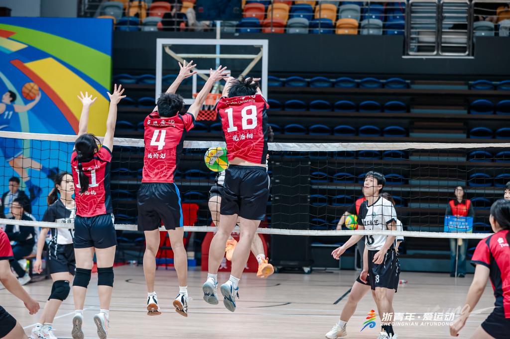 TU formed a strong team for this tournament. The coaching staff comprised Li Hongqin, Xu Jin, Gan Runze, and Dai Zhenzhen from the School of Teacher Education (Physical Education). The team members consisted of 10 students from various majors on campus. In the group round-robin matches, TU’s team successively defeated the teams from Zhejiang Open University and Zhejiang Sci-Tech University, advancing to the quarter-final with an unbeaten record. In the cross-elimination matches, the team maintained their high level of performance, defeating the teams from Zhejiang University of Technology and Huzhou University, thus advancing to the finals with an overwhelming advantage. Although they narrowly lost in the championship match, the team’s fighting spirit on the court earned them thunderous applause from the audience.